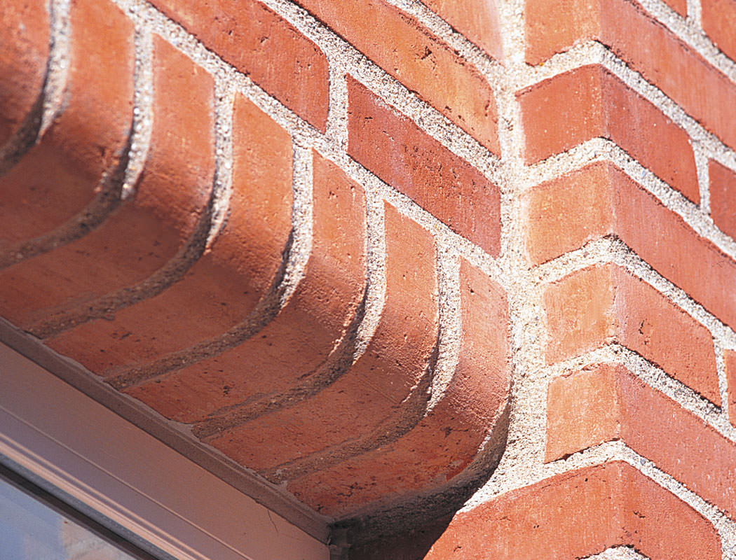 Gebogene Rollschicht mit Formziegeln. Die Rollschicht ist aus roten Wasserstrich-Formziegeln mit Krümmung gearbeitet und somit an die Krümmung der Fassade angepasst. Als Widerlager kommen eingearbeitete Edelstahl-Aufhängungsbügel zum Einsatz.