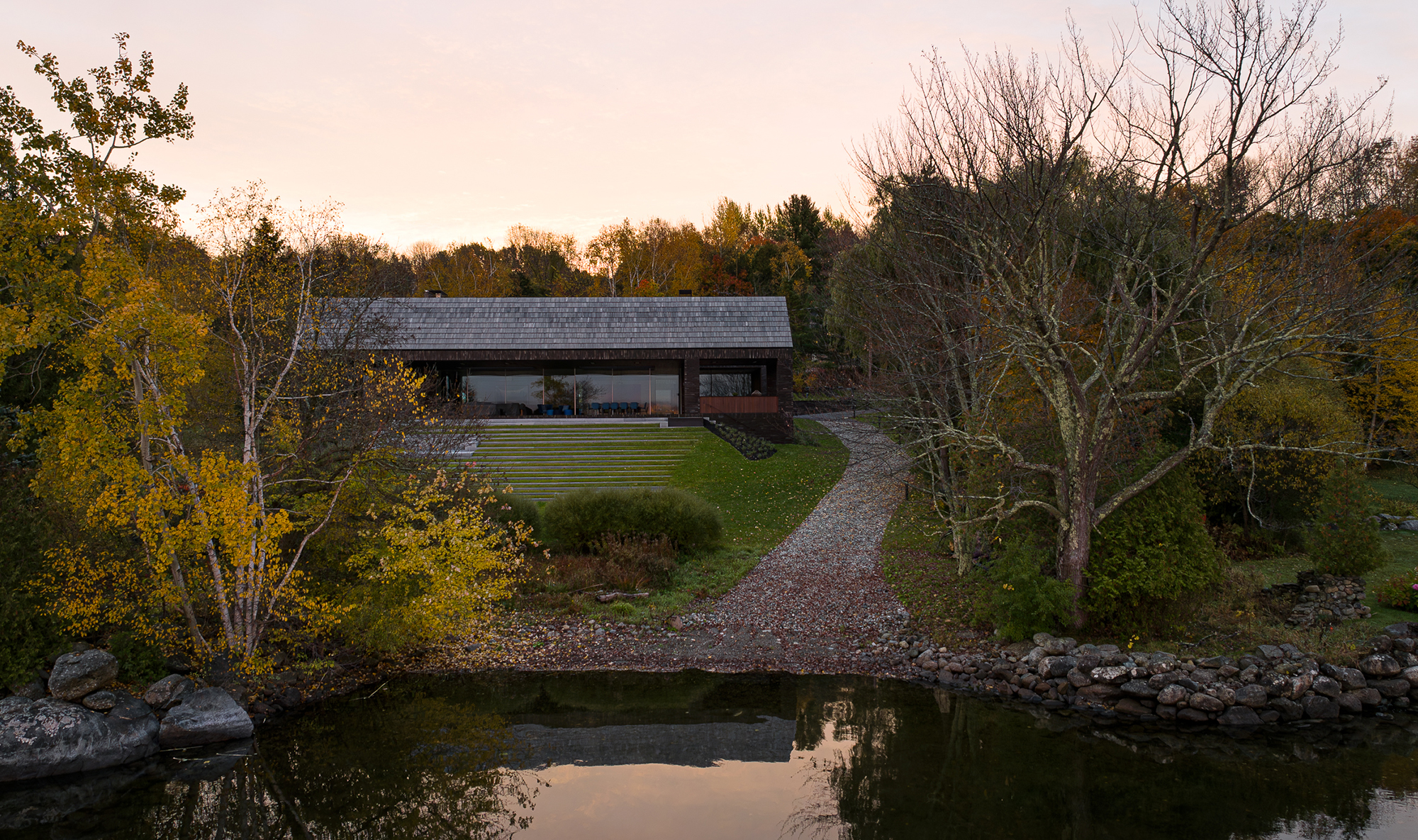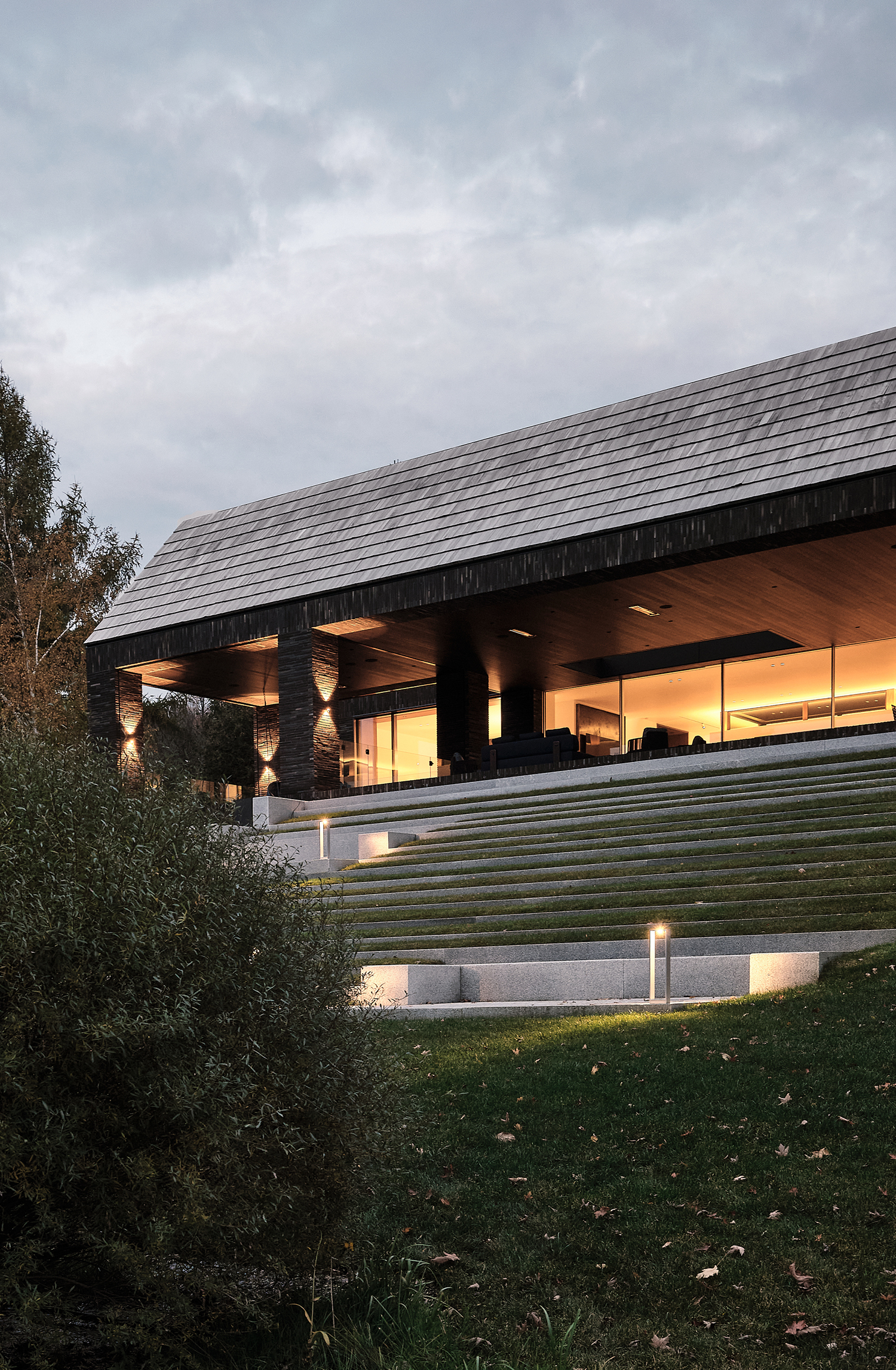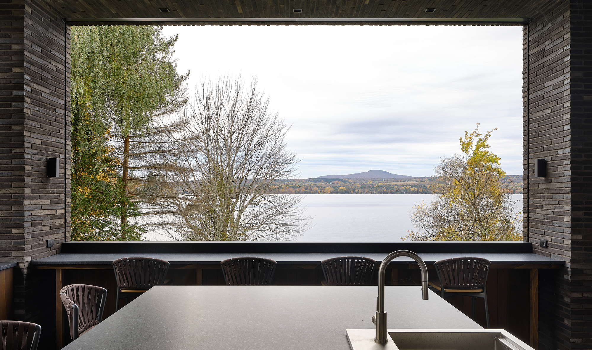 Das kanadische Bauvorhaben vereint Stahlbeton, Stahlrahmen und Ziegelwände in einem eleganten Konstrukt. Ein innovatives Struktursystem ermöglicht den Einsatz von Glas mit Spannweiten über 15 Metern, wodurch der Blick auf den Lake Memphremagog und die umliegende Natur ungestört bleibt.