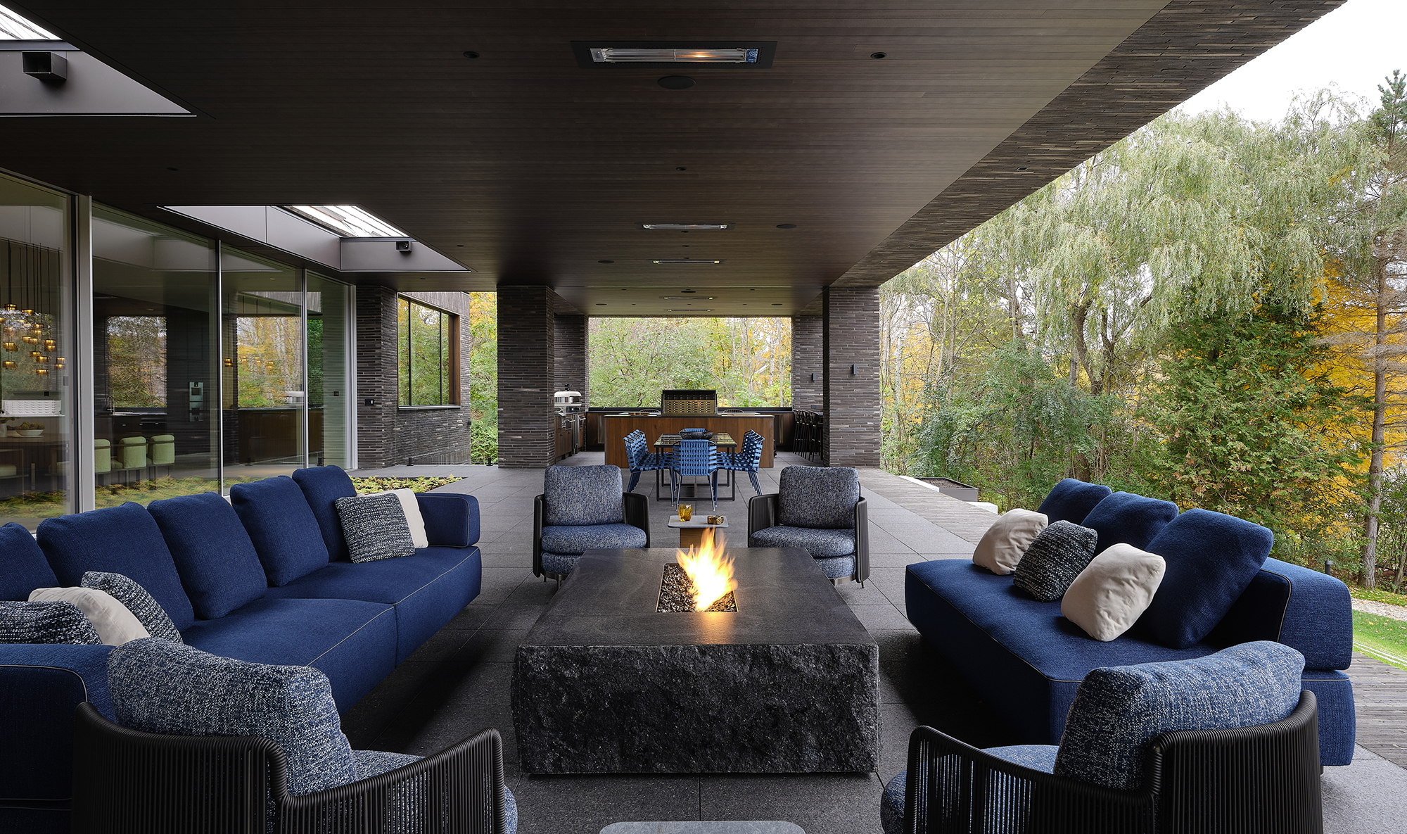 Die sorgfältig ausgewählten, natürlichen Materialien im Innen- und Außenbereich sind so konzipiert, dass sie mit der Zeit Patina ansetzen und den Wandel der Jahre reflektieren. Die Außenwände sind mit dem dunkel getönten Randers Tegl Wasserstrichziegel ULTIMA RT 151 aus Dänemark verkleidet. Die übergroßen Dachbalken wurden in einer lokalen Werkstatt maßgefertigt, während das Mauerwerk von Terrasse, Garten, Außenküche und Kamin aus einer Mischung lokal gefundener schwarzer und grauer kambrischer Granitsteine besteht. Im Inneren zeichnet sich die Kücheninsel durch einen robusten Steinblock mit geflammter Nussbaumplatte und natürlicher Baumkante aus, die eine stilvolle Barhöhe schafft.